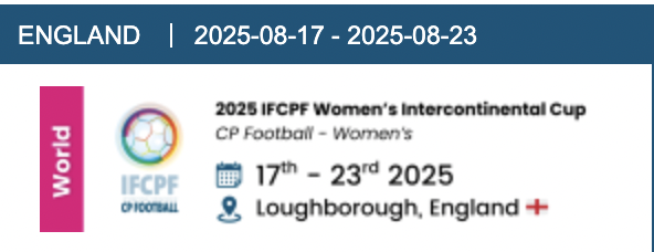 Van 16 t/m 24 augustus 2025 vindt de IFCPF Women Intercontinental Cup plaats in Loughborough, Engeland. Dit internationale toernooi wordt georganiseerd door de IFCPF (International Federation of Cerebral Palsy Football) en brengt de beste CP-teams uit de wereld samen.