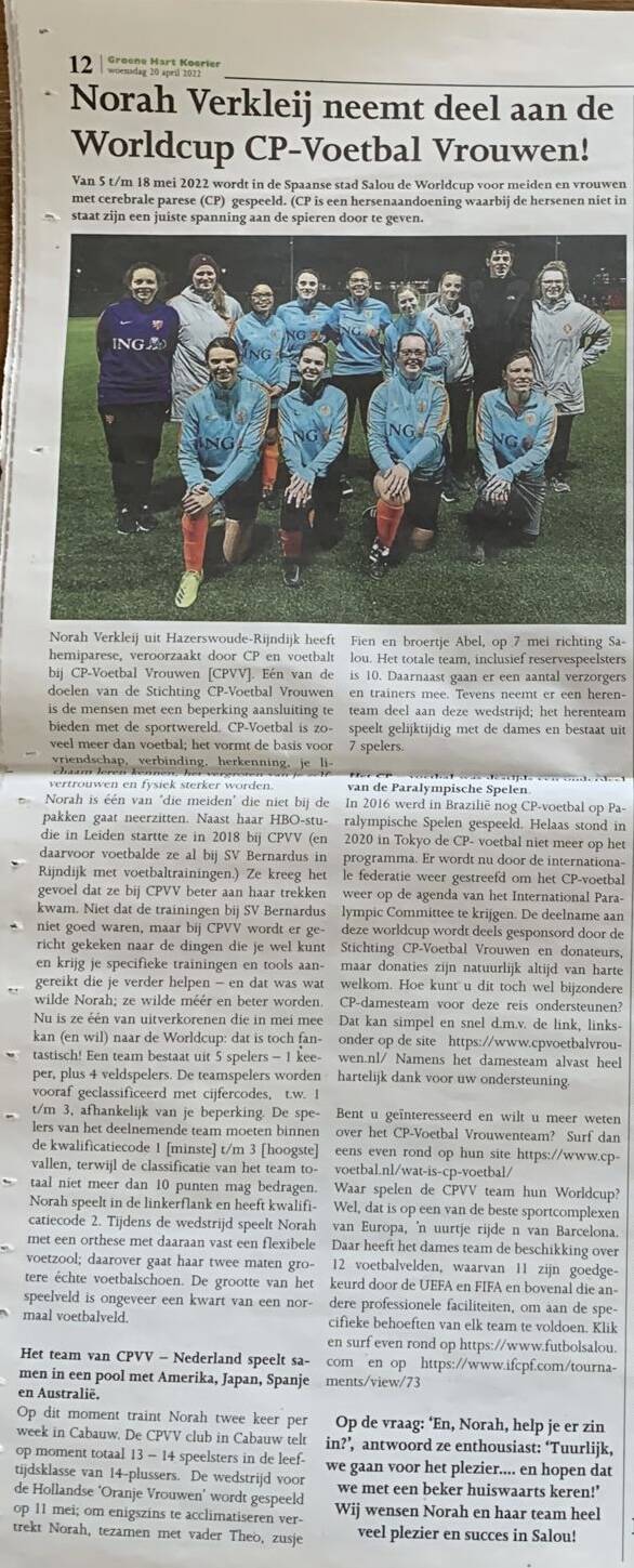 Daarnaast is Jara ook geïnterviewd door de krant 'Het Kontakt'. Zij speelde samen met het CP vrouwenvoetbal team tegen een meiden team van haar eigen club VV Cabauw.